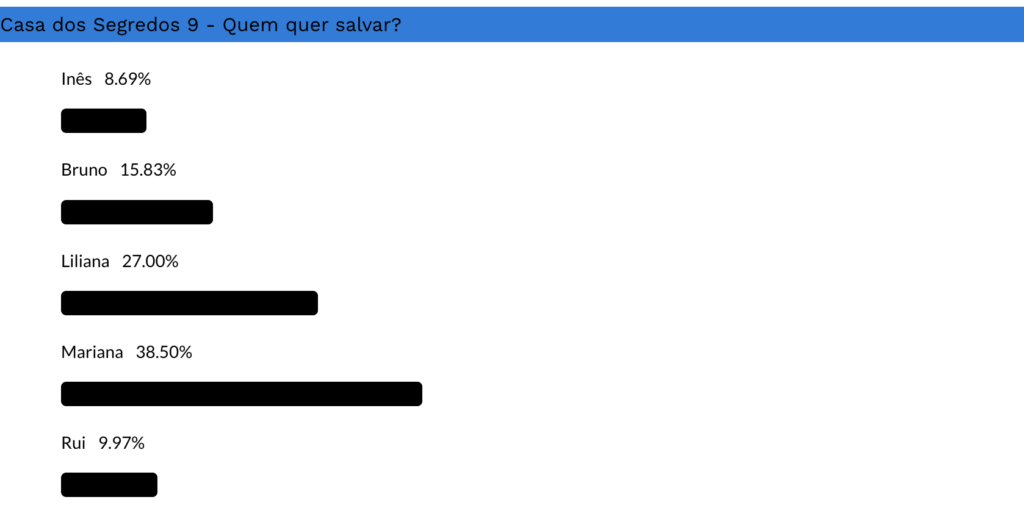 Vamos espreitar como anda a sondagem esta quinta-feira, 23 de outubro. Com 38,50% dos votos, Mariana é a concorrente mais votada para salvar, seguida de Liliana, com 27% dos votos e Bruno com 15,83% dos votos. Inês e Rui são os menos votados para salvar com 8,69% e 9,97% dos votos, respetivamente.