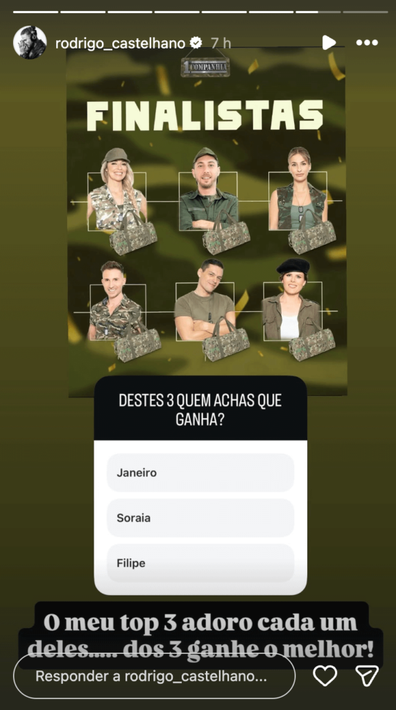 Rodrigo Castelhano partilhou a sua escolha nas redes sociais, destacando os três recrutas que considera mais merecedores e deixando claro o carinho que nutre por cada um deles: “O meu top 3 adoro cada um deles…. dos 3 ganhe o melhor!”