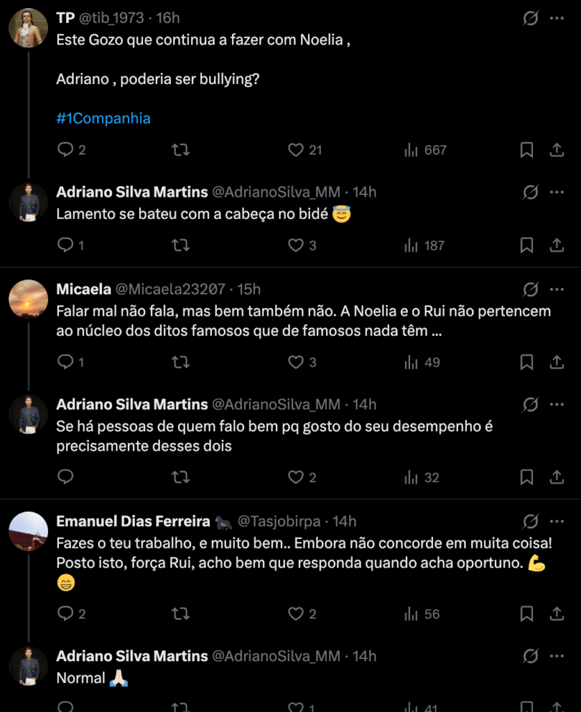 Apesar das tentivas de defesa, Adriano Silva Martins continuou a ser alvo de duras críticas: “Não falou mal. Apenas já cansa ouvir comentários sobre o tom de voz da Noélia. Há tantos portugueses que falam alto e sempre houve e vai continuar a haver! Temos de nos habituar ao tom de voz de cada um. Ou será que é proibido falar alto? Eu também falo alto tal como a Noélia !”. O comentador mais uma vez reagiu e defendeu-se: “Brinquei com isso. O humor hoje está de folga?”