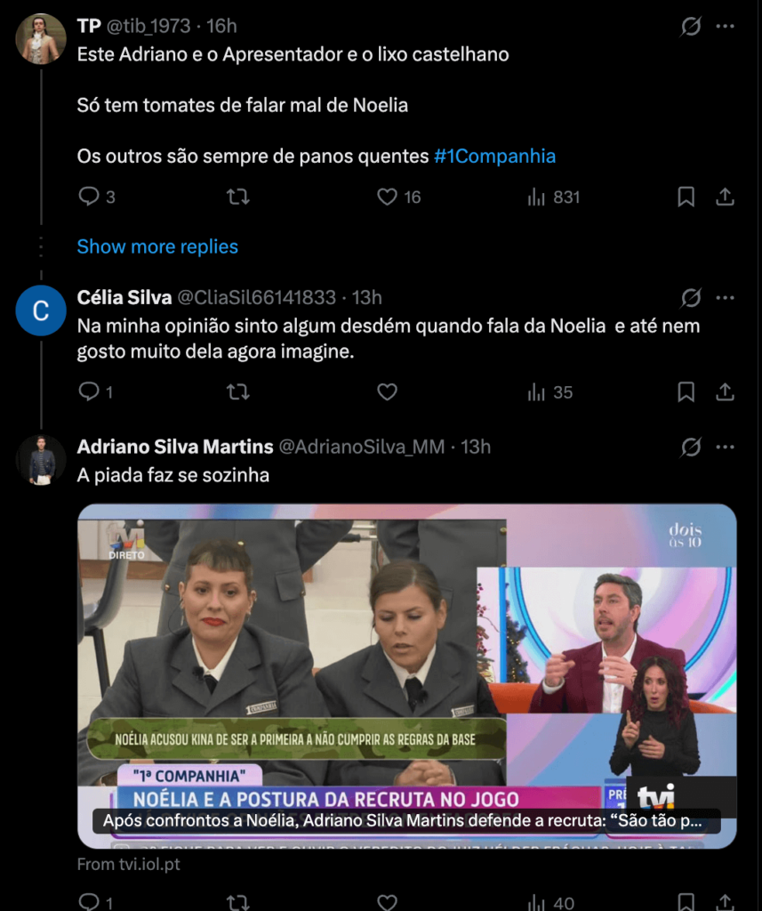 “Na minha opinião sinto algum desdém quando fala da Noelia e até nem gosto muito dela agora imagine.”, atirou outro internauta. O comentador da TVI não se ficou: “A piada faz se sozinha”, escreveu Adriano, que acrecentou uma notícia onde dá conta que saiu em defesa de Noélia Pereira.