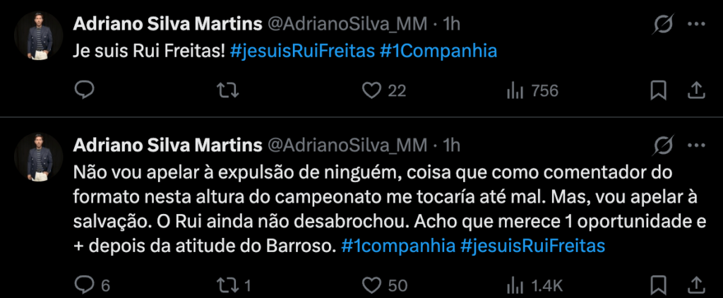 Na rede social X, Adriano Silva Martins deixou um apelo pela salvação de Rui Freitas, “Não vou apelar à expulsão de ninguém, coisa que como comentador do formato nesta altura do campeonato me tocaría até mal. Mas, vou apelar à salvação. O Rui ainda não desabrochou. Acho que merece 1 oportunidade e + depois da atitude do Barroso.”, começou por apelar o comentador. “Je suis Rui Freitas!”, acrescentou ainda.