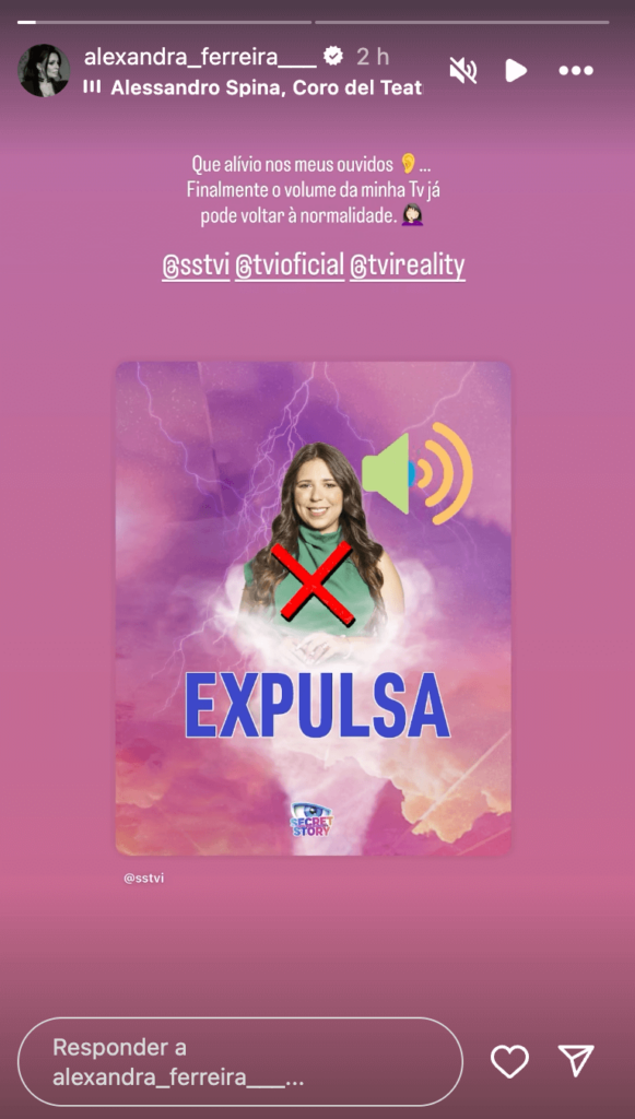 Cansada de ouvir a voz estridente da concorrente, Alexandra Ferreira celebrou a sua expulsão e confessa que já vai poder voltar a pôr som na sua televisão: “Que alívio nos meus ouvidos. Finalmente o volume da minha Tv já pode voltar à normalidade.”