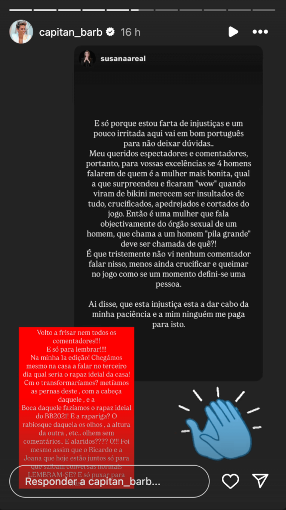 Ana Barbosa, veterana dos reality shows, reagiu às críticas da especialista e aplaudiu os seus comentários. A ‘Capitã Barbosa’ destacou que concorda com Susana Areal, mas que não engloba as críticas a todos os comentadores: “Atenção! Nem todos os comentadores! Na minha opinião! Mas de resto concordo a 300%.”