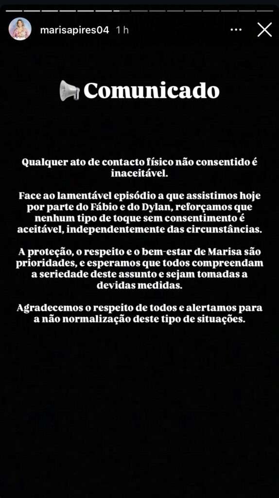 “Qualquer ato de contacto fisico nao consentido e inaceitável. Face ao lamentável episódio a que assistimos hoje por parte do Fabio e do Dylan, reforçamos que nenhum tipo de toque sem consentimento é aceitável, independentemente das circunstâncias.”, começou por dizer a família da concorrente no comunicado.