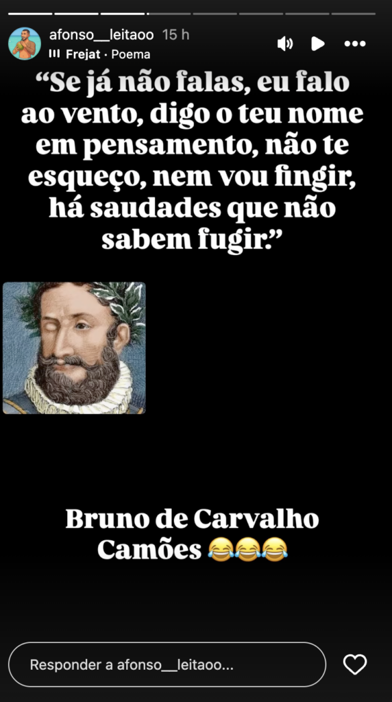 O ex-militar não se deixou ficar deixou uma ameaça ao ex-presidente do Sporting: “Se já não falas, eu falo ao vento, digo o teu nome em pensamento, não te esqueço, nem vou fingir, há saudades que não sabem fugir.”, que acrescentou de seguida: “Bruno de Carvalho Camões”.