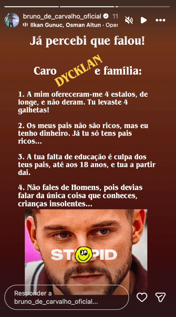 O ex-presidente do Sporting, não foi brando e deixou alguns recados ao jovem de Viana de Castelo: “Caro DYCKLAN e família: A mim ofereceram-me 4 estalos, de longe, e não deram. Tu levaste 4 galhetas! Os meus pais não são ricos, mas eu tenho dinheiro. Já tu só tens pais ricos… “, começou por dizer.