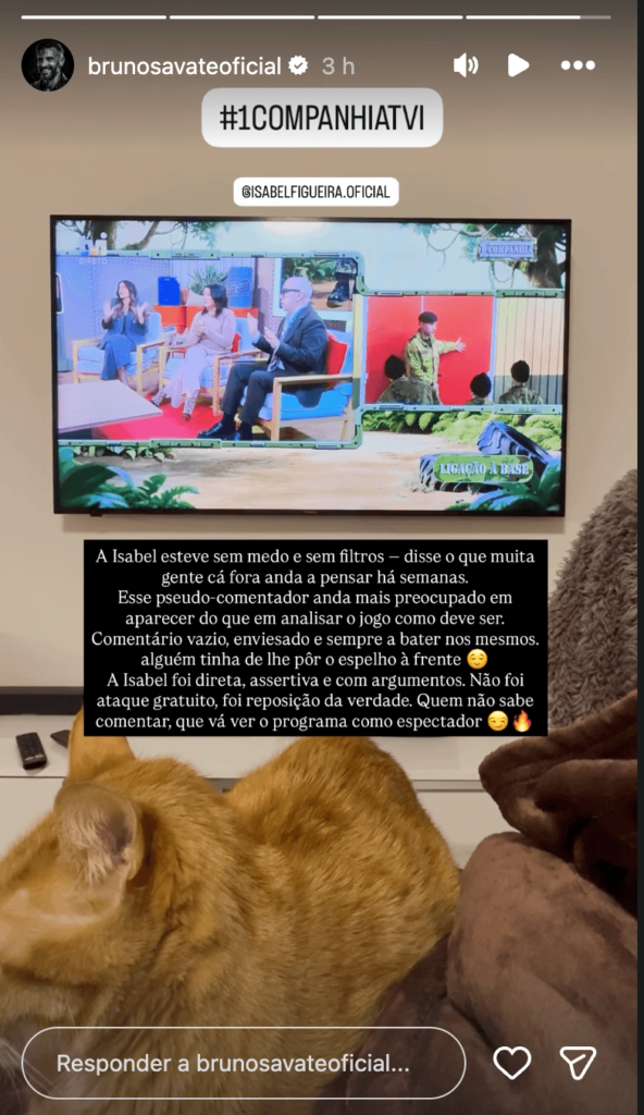 Cá fora, as reações não tardaram. Bruno Savate, veterano dos reality shows e seguidor atento do programa da TVI, decidiu pronunciar-se sobre o episódio e saiu em defesa de Isabel Figueira. Nas suas redes sociais, Savate não foi brando nas críticas a António Leal e Silva, chegando mesmo a classificá-lo de “pseudo-comentador”.