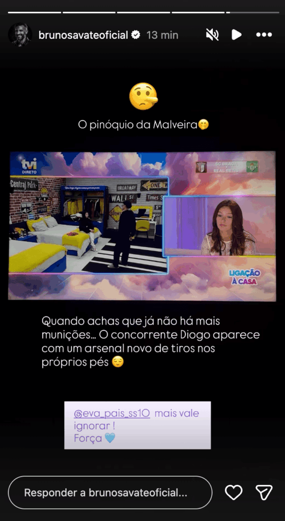 Para fechar, Savate deixou um conselho direto a Eva, que tem tentado confrontar Diogo com a realidade do que vê e ouve: “Eva, mais vale ignorar! Força.”