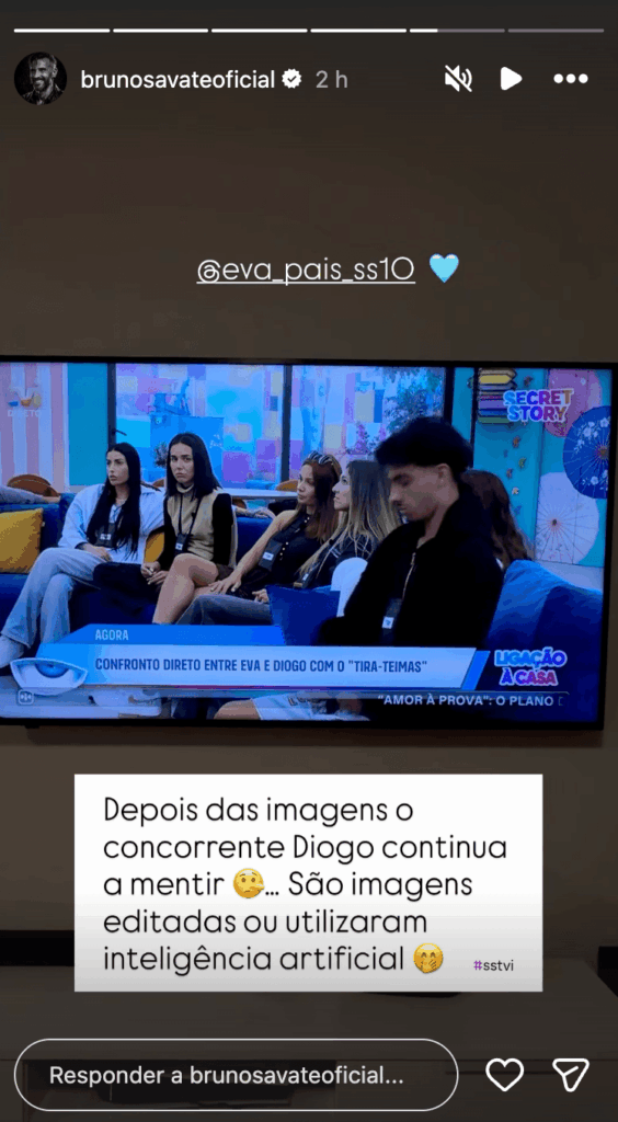 Cá fora, Bruno Savate não ficou em silêncio e reagiu de imediato nas suas redes sociais, mostrando-se em choque com a persistência de Diogo em negar o que foi mostrado a toda a casa: “Depois das imagens, o concorrente Diogo continua a mentir… São imagens editadas ou utilizaram inteligência artificial.”