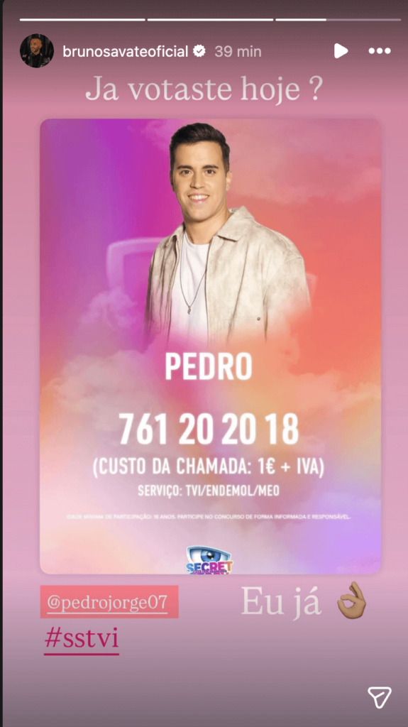 “Já votaste hoje? Eu já”, escreveu Savate, na legenda da publicação, onde divulgou o número de votação para salvar Pedro Jorge.