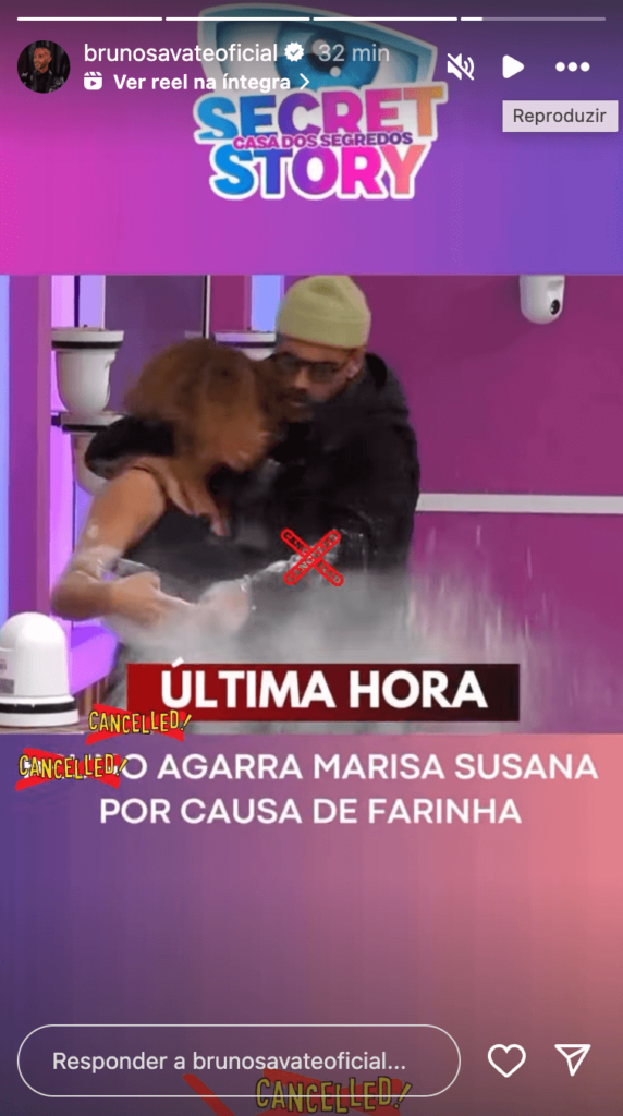 O veterano dos reality shows ‘apela’ pelo cancelamento de Bruno e para além de partilhar o vídeo do momento que Bruno tenta arrancar a taça com a farinha das mãos de Marisa Susana, pode ler-se vários ‘Cancelled’.