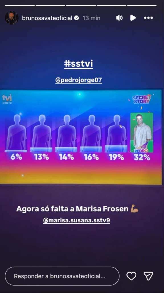 Savate mostrou-se a ver a gala em direto e pode ouvir-se quando anunciam o primeiro salvo: “O Pedro… Óbvio”. Na legenda da publicação, Savate não escondeu que aguarda impaciente pela salvação de Marisa Susana: “Agora só falta a Marisa Frosen”.