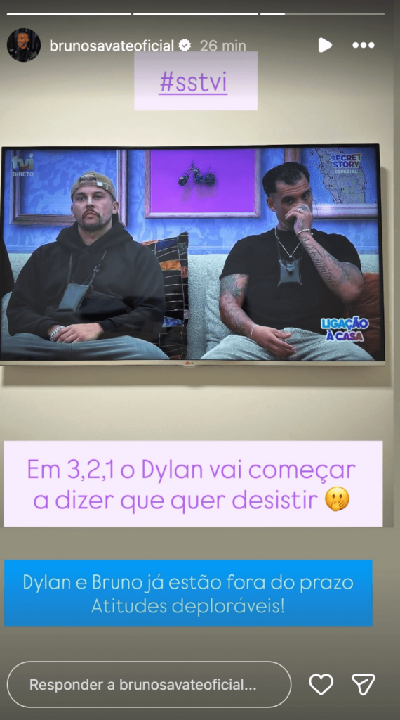 Pouco depois, o veterano dos reality shows atirou a sua previsão e não falhou: “Em 3,2,1 o Dylan vai começar a dizer que quer desistir. Dylan e Bruno já estão fora do prazo. Atitudes deploráveis!”