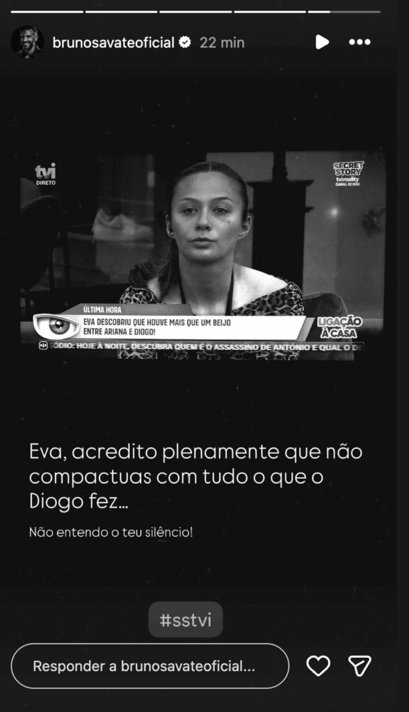 Savate reservou ainda uma mensagem direta para Eva, mostrando-se incapaz de compreender o silêncio da concorrente de Ovar perante tudo o que aconteceu nas últimas semanas: “Eva, acredito plenamente que não compactuas com tudo o que o Diogo fez…. Não entendo o teu silêncio!”