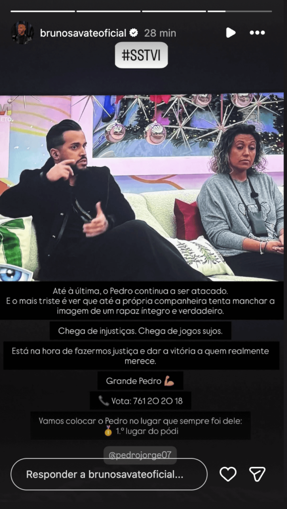 “Até à última, o Pedro continua a ser atacado. E o mais triste é ver que até a própria companheira tenta manchar a imagem de um rapaz íntegro e verdadeiro.”, lamentou Savate, que apelou de seguida: “Chega de injustiças. Chega de jogos sujos.”