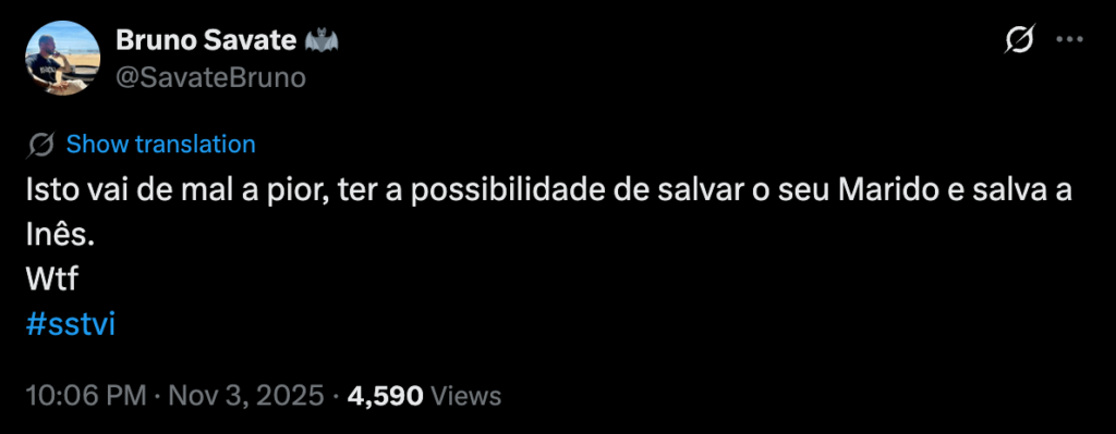 Bruno Savate, veterano dos reality shows, também já reagiu e atirou-se mais uma vez contra Marisa: “Isto vai de mal a pior, ter a possibilidade de salvar o seu Marido e salva a Inês. Wtf”.