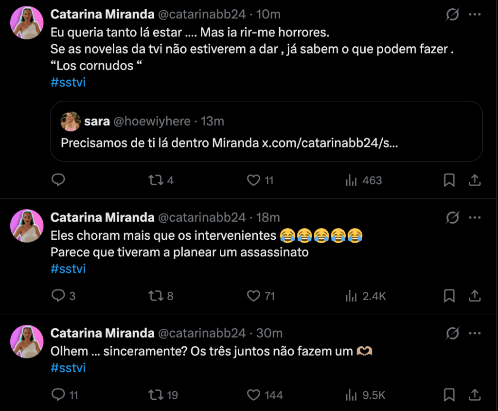 Miranda considerou exageradas as reações de quem está cá fora a acompanhar o caso, comparando o ambiente a algo digno de uma novela: “Eles choram mais que os intervenientes. Parece que tiveram a planear um assassinato.” Sobre os envolvidos, foi ainda mais direta e cortante, resumindo tudo numa frase: “Os três juntos não fazem um.” A ex-concorrente admitiu ainda que adoraria estar na casa para assistir ao espetáculo ao vivo, garantindo que se ia “rir horrores” e deixou uma sugestão irónica para a TVI: “Se as novelas não estiverem a dar, já sabem o que podem fazer. Los cornudos.”