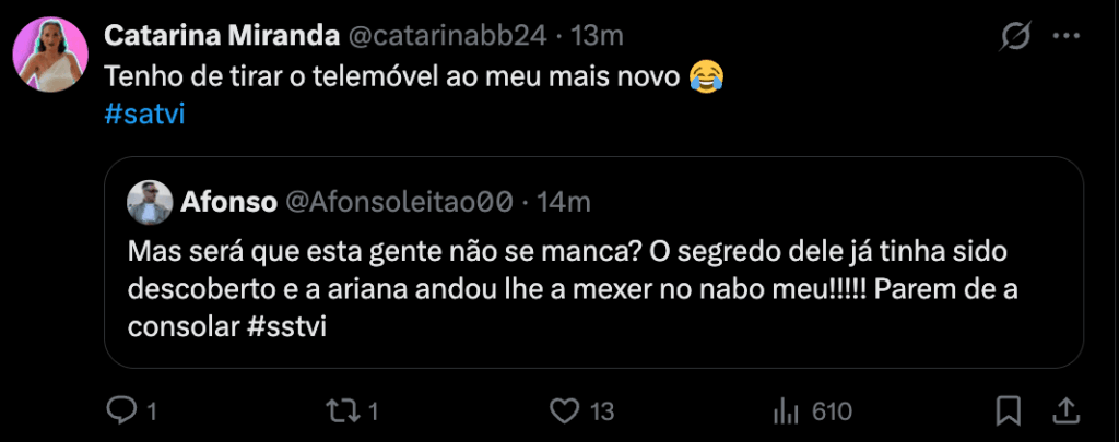 Mas Miranda não foi a única voz da família a fazer-se ouvir, Afonso Leitão, seu namorado, também entrou na conversa e mostrou-se claramente irritado com a onda de solidariedade em torno de Ariana. Para Afonso, toda a indignação é hipócrita: o segredo de Diogo já era conhecido há semanas, e ainda assim ninguém se escandalizou enquanto Ariana se aproximava dele. “Mas será que esta gente não se manca? O segredo dele já tinha sido descoberto e a Ariana andou lhe a mexer no nabo meu!!!!! Parem de a consolar”, atirou, sem deixar margem para dúvidas. A polémica está longe de terminar e as redes sociais continuam ao rubro.