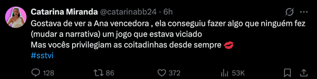 Contudo, o destaque da publicação foi a farpa ácida lançada sobre o perfil de concorrente que, historicamente, o público português tende a premiar. “Mas vocês privilegiam as coitadinhas desde sempre”, atirou a comentadora.