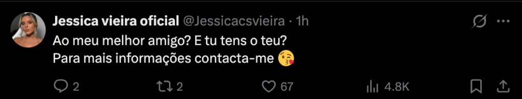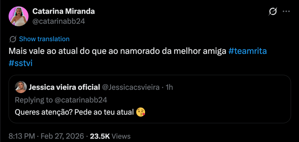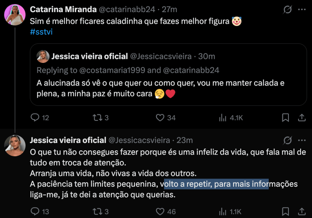 Jéssica não ficou calada e respondeu na mesma moeda: “Queres atenção? Pede ao teu atual.” Miranda aproveitou então para lançar uma farpa direcionada à relação entre Jéssica e Marcelo Palma, ex-namorado de Rita Almeida: “Mais vale ao atual do que ao namorado da melhor amiga“. A vencedora do Big Brother Verão reagiu de imediato, deixando uma resposta enigmática que prometia mais desenvolvimentos: “Ao meu melhor amigo? E tu tens o teu? Para mais informações contacta-me.”