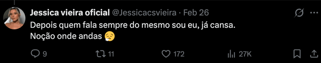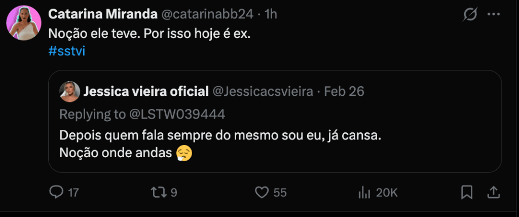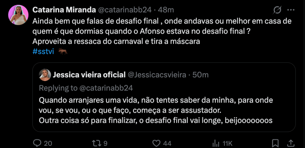 Tudo começou com Jéssica a reagir a um vídeo de Afonso Leitão, deixando uma indireta que não passou despercebida: “Depois quem fala sempre do mesmo sou eu, já cansa. Noção onde andas.”. Catarina Miranda não deixou passar a provocação e entrou de imediato na discussão, defendendo o namorado: “Noção ele teve. Por isso hoje é ex.”