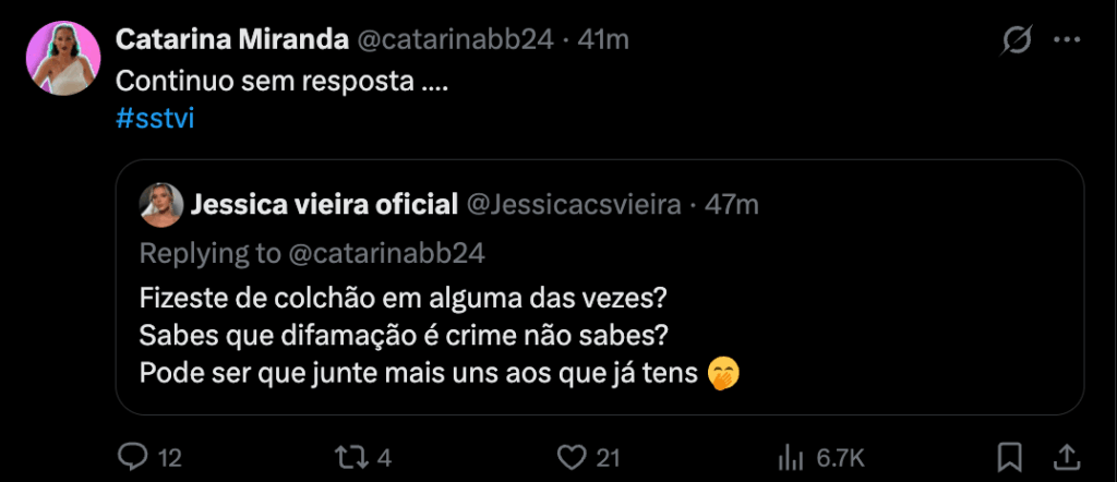 Miranda não resistiu e aproveitou a menção ao Desafio Final para lançar mais uma farpa, desta vez de cariz mais pessoal: “Ainda bem que falas de desafio final, onde andavas ou melhor em casa de quem é que dormias quando o Afonso estava no desafio final? Aproveita a ressaca do carnaval e tira a máscara“. Jéssica respondeu com uma ameaça velada e um aviso sobre os limites legais da discussão: “Fizeste de colchão em alguma das vezes? Sabes que difamação é crime não sabes? Pode ser que junte mais uns aos que já tens.”