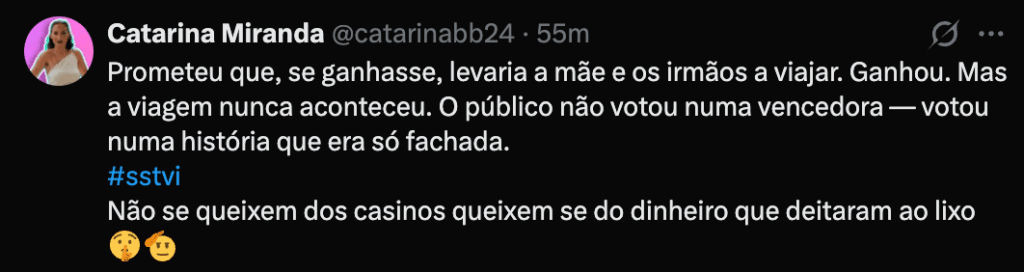 Miranda decidiu então mudar de tema e atacou Jéssica com uma referência direta à sua passagem pelo Secret Story, colocando em causa as promessas feitas pela concorrente durante o programa: “Prometeu que, se ganhasse, levaria a mãe e os irmãos a viajar. Ganhou. Mas a viagem nunca aconteceu. O público não votou numa vencedora , votou numa história que era só fachada. Não se queixem dos casinos queixem-se do dinheiro que deitaram ao lixo“. Jéssica respondeu com um aviso claro, deixando também uma indireta ao Desafio Final: “Quando arranjares uma vida, não tentes saber da minha, para onde vou, se vou, ou o que faço, começa a ser assustador. Outra coisa só para finalizar, o desafio final vai longe, beijooooooos.”