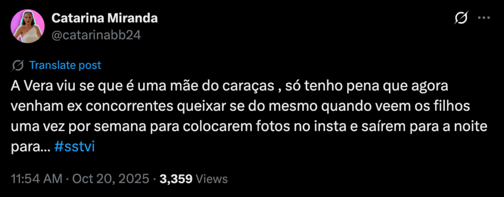 “A Vera viu se que é uma mãe do caraças”, começou por dizer Catarina Miranda, que prosseguiu de seguida com ‘bocas’ a ex-concorrentes: “Só tenho pena que agora venham ex concorrentes queixar se do mesmo quando veem os filhos uma vez por semana para colocarem fotos no insta e saírem para a noite para…”.