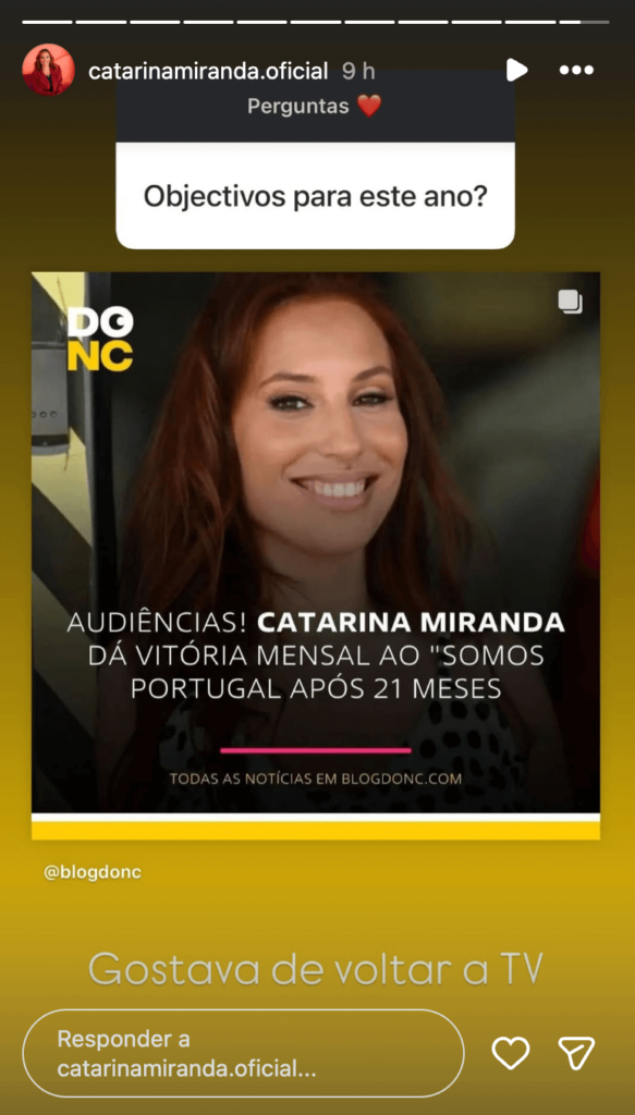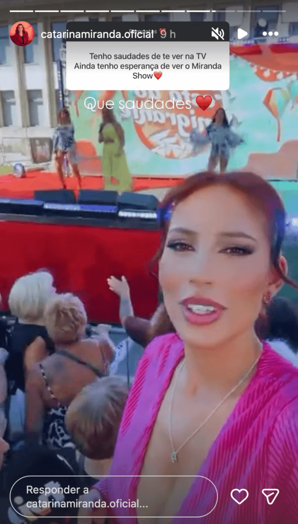 “Tenho saudades de te ver na TV. Ainda tenho esperança de ver o Miranda Show”, confessou um seguidor. Miranda reagiu e confessou: “Que saudades”. Pouco depois, outro seguidor questionou: “Objectivos para este ano?“. Catarina Miranda confessou que o seu maior sonho era regressar ao pequeno ecrã: “Gostava de voltar a TV”.