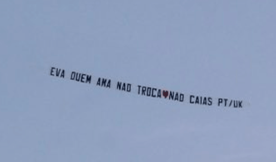 “EVA, QUEM AMA NÃO TROCA. NÃO CAIAS. PT/UK“, podia ler-se na faiza de avião.