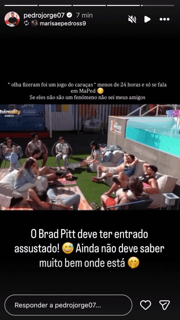 Durante a discussão sobre Marisa e Pedro, Ricardo João pareceu completamente perdido, sem perceber o tema da conversa – uma situação que não passou despercebida aos fãs de Pedro Jorge, que comentaram nas redes sociais: “O Brad Pitt deve ter entrado assustado! Ainda não deve saber muito bem onde está.”