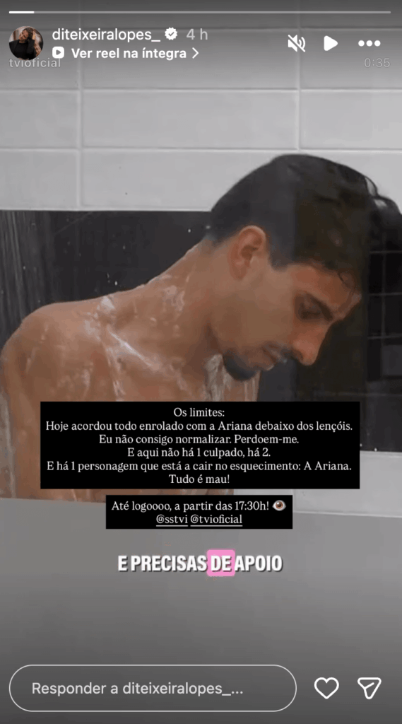 Diana Lopes partilhou nas redes sociais um vídeo de Eva e Diogo, que revelou um momento que deixou muita gente de boca aberta, Eva, sozinha com Diogo na casa de banho, acabou por dar carta verde ao namorado para beijar Ariana se isso for necessário para proteger o segredo, mas deixando bem claro onde está o limite: “Quando eu digo há um limite, é porque te podes esbardalhar ao cumprido. Continua mas é só neste registo: ‘Prova-me isto… dá-me um beijo para provares isto’- chapa, logo. Mas nada mais do que isto.”