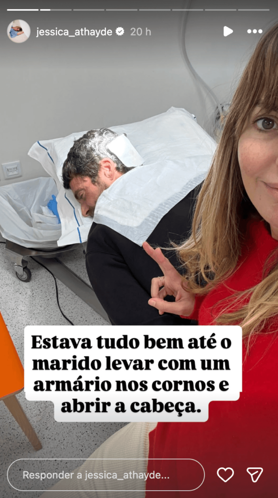 Depois do susto inicial e já com a situação controlada, Jéssica Athayde partilhou nas redes sociais imagens do marido a ser socorrido na unidade hospitalar, e com o humor que lhe é costumo, brincou com a situação: “Estava tudo bem até o marido levar com um armário nos cornos e abrir a cabeça”.