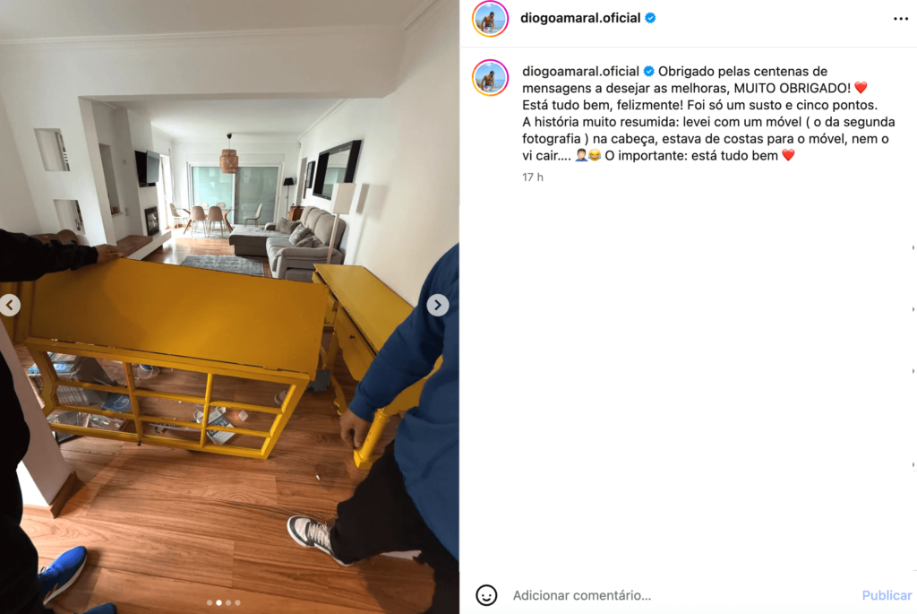 O incidente ocorreu quando Diogo Amaral se encontrava de costas e foi apanhado completamente desprevenido. “Levei com um móvel na cabeça, estava de costas para o móvel nem o vi cair… O importante: está tudo bem”, explicou o ator, tranquilizando os seguidores sobre o seu estado de saúde. Numa publicação posterior, Diogo revelou ainda que o acidente aconteceu enquanto preparava uma mudança, tendo necessitado de “quatro ou cinco pontos” para tratar o ferimento.