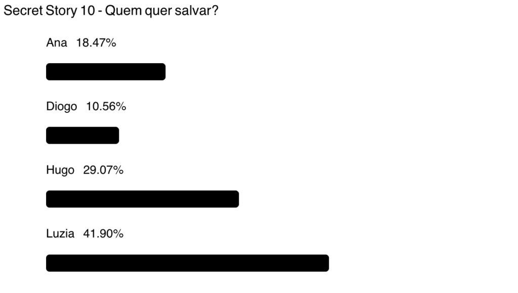 1.º Luzia — 41,90%: Luzia lidera de forma destacada a sondagem para ser salva, com quase 42% dos votos, um resultado expressivo que a coloca numa posição muito confortável. Recorde-se que esta não é a primeira vez que Luzia está em risco. Resta saber se o aceso confronto com Sara no pós gala deste domingo, vai prejudicar a concorrente.