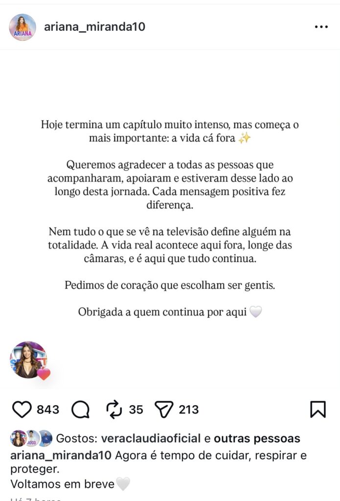 A equipa começou por assinalar o fim de um capítulo e o início de outro, deixando claro que a vida real de Ariana começa agora, longe das câmaras: “Hoje termina um capítulo muito intenso, mas começa o mais importante: a vida cá fora. Queremos agradecer a todas as pessoas que acompanharam, apoiaram e estiveram desse lado ao longo desta jornada. Cada mensagem positiva fez diferença.”