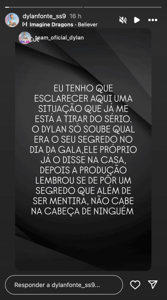 “Eu tenho que esclarecer aqui uma situação que já me está a tirar do sério. O Dylan só soube qual era o seu segredo no dia da gala, ele próprio já o disse na casa. Depois, a produção lembrou-se de pôr um segredo que, além de ser mentira, não cabe na cabeça de ninguém.”, podia ler-se.