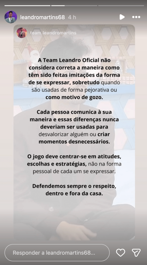 A equipa de Leandro já reagiu à polémica e emitiu um comunicado a condenar o episódio: “A Team Leandro Oficial não considera correta a maneira como têm sido feitas imitações da forma de se expressar, sobretudo quando são usadas de forma pejorativa ou como motivo de gozo. Cada pessoa comunica à sua maneira e essas diferenças nunca deveriam ser usadas para desvalorizar alguém ou criar momentos desnecessários.”, começaram por dizer.