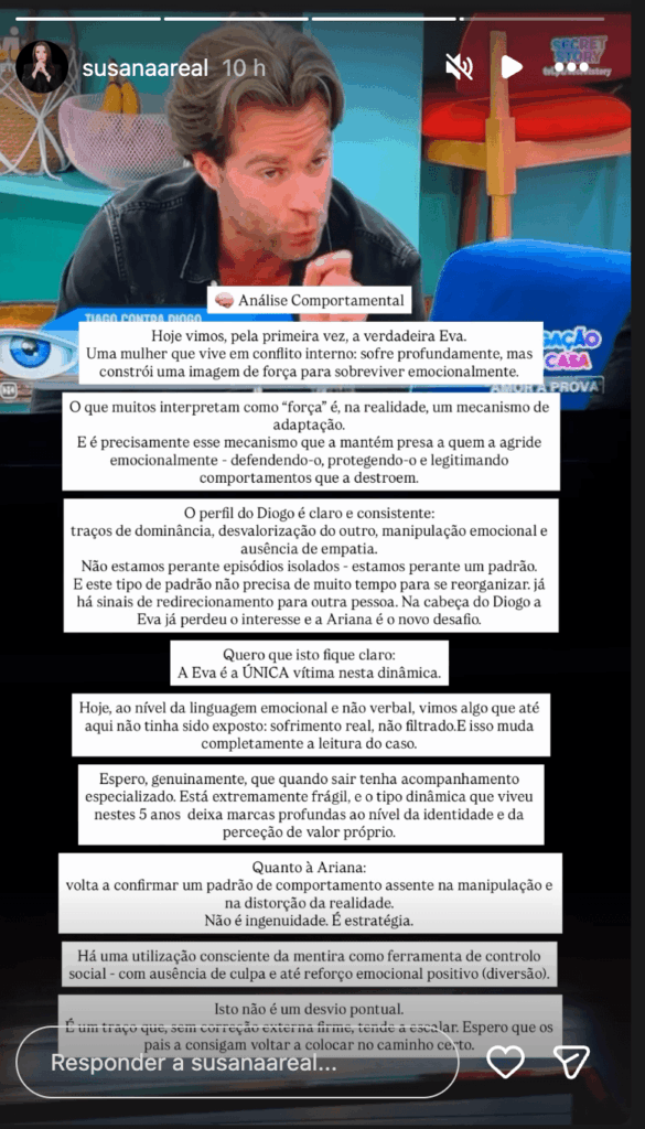 Sobre Diogo, Susana Areal não deixou margem para dúvidas, traçando um perfil comportamental preocupante e avisando que o fim da relação com Eva não significa o fim do padrão: “O perfil do Diogo é claro e consistente: traços de dominância, desvalorização do outro, manipulação emocional e ausência de empatia. Não estamos perante episódios isolados, estamos perante um padrão. E este tipo de padrão não precisa de muito tempo para se reorganizar. Já há sinais de redirecionamento para outra pessoa. Na cabeça do Diogo, a Eva já perdeu o interesse e a Ariana é o novo desafio.”