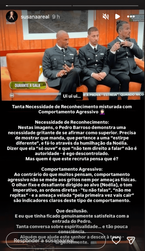 “Tanta Necessidade de Reconhecimento misturada com Comportamento Agressivo”, começou por afirmar a profiler, que se mostrou visivelmente desiludida com a postura do ator com Noélia: “Nestas imagens, o Pedro Barroso demonstra uma necessidade gritante de se afirmar como superior. Precisa de mostrar que manda, que pertence a uma “estirpe diferente”, e fá-lo através da humilhação da Noélia. Dizer que ela “só ouve” e que “não tem direito a falar” não é autoridade – é ego descontrolado. Mas quem é que este recruta pensa que é?”