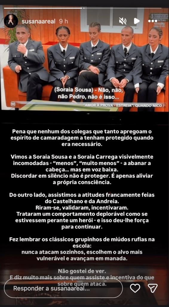 A especialista destacou ainda que apesar de ver algumas concorrentes desconfortáveis, ninguém parou Pedro Barroso, da humilhação que fez a Noélia: “Vimos a Soraia Sousa e a Soraia Carrega visivelmente incomodadas – “menos”, “muito menos” – a abanar a cabeça… mas em voz baixa. Discordar em silêncio não é proteger. É apenas aliviar a própria consciência. Do outro lado, assistimos a atitudes francamente feias do Castelhano e da Andreia.”