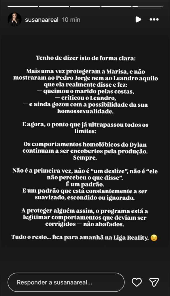 De seguida, Susana Areal criticou que a produção não tome medidas em relação a Dylan, que tem tido constantemente comportamentos homofóbicos: “E agora, o ponto que já ultrapassou todos os limites: Os comportamentos homofóbicos do Dylan continuam a ser encobertos pela produção. Sempre. Não e a primeira vez, não e “um deslize”, não e “ele não percebeu o que disse” É um padrão. E um padrão que está constantemente a ser suavizado, escondido ou ignorado. A proteger alguém assim, o programa está a legitimar comportamentos que deviam ser corrigidos – não abafados.“