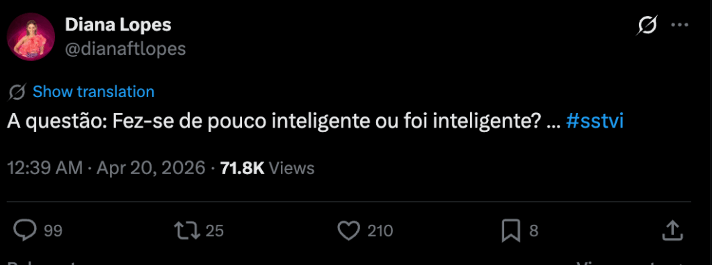 Diana Lopes lançou a questão que está na boca de todos: “A questão: fez-se de pouco inteligente ou foi inteligente?” Os fãs da comentadora dividiram-se nas respostas: “Bloqueou e foi lerda. Mas não se fez.”, “Por um lado, acho que foi inteligente. Vai salvar a contracena que ela tem. Por outro lado, parou o miolo.”, “Não ganhava nada em fazer isto de propósito. As pessoas ficaram uma beca desiludidas, por isso acredito que foi sincera.” e “Ela não percebeu a dinâmica das nomeações. Ela entrou tão eufórica a falar de quem viu na plateia que se confundiu toda. As nomeações dela não fizeram sentido, tanto é assim que lhe explicaram três vezes o mesmo e ela continuou sem perceber.” Mas nem todos acreditam na versão da confusão genuína: “Ela literalmente disse que salvava a Ana para ter confusões esta semana!! Não sei como ninguém ouviu isto! Ela sabia perfeitamente que era para salvar. Tudo a seguir foi teatro!”
