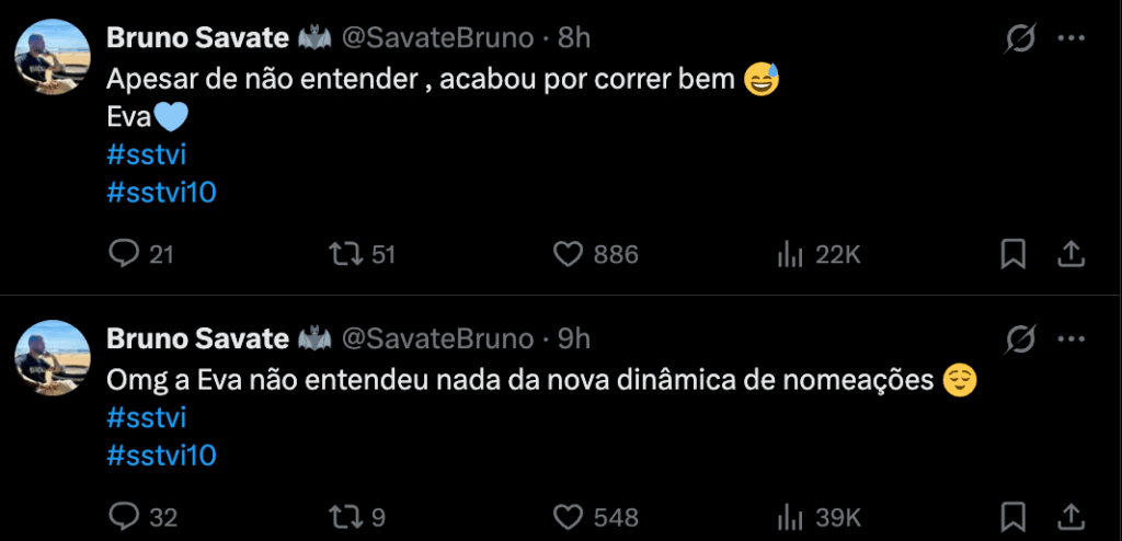 Bruno Savate também não ficou indiferente ao momento e reagiu com uma mistura de espanto e alívio: “Omg, a Eva não entendeu nada da nova dinâmica de nomeações.” O veterano respirou de alívio ao constatar que Tiago tinha ficado a salvo apesar do voto de Eva: “Apesar de não entender, acabou por correr bem, Eva.” Os fãs de Savate também não pouparam nos comentários: “Não entendeu? Entendeu muito bem.” e “Savate, peço desculpa, mas a esta altura do campeonato estes erros não se perdoam. Então a ‘jogadora’ da casa, que jogo nem vê-lo, esquece-se daquele que sempre esteve lá para ela? Mais valia apoiares o Tiago, esse ao menos jogou com uma Sara, Hugo, Ana e Ricardo João e protege os seus.”