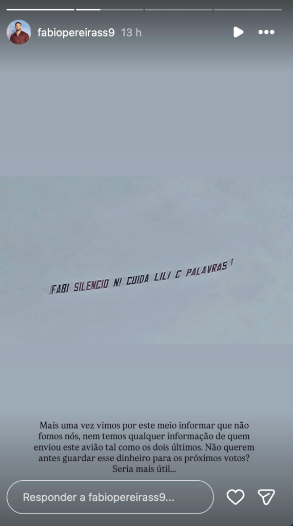 A família de Fábio já reagiu e fez um esclarecimento sobre o polémico avião: “Mais uma vez vimos por este meio informar que não fomos nós, nem temos qualquer informação de quem enviou este avião tal como os dois últimos.”, começou por esclarecer a família do concorrente.