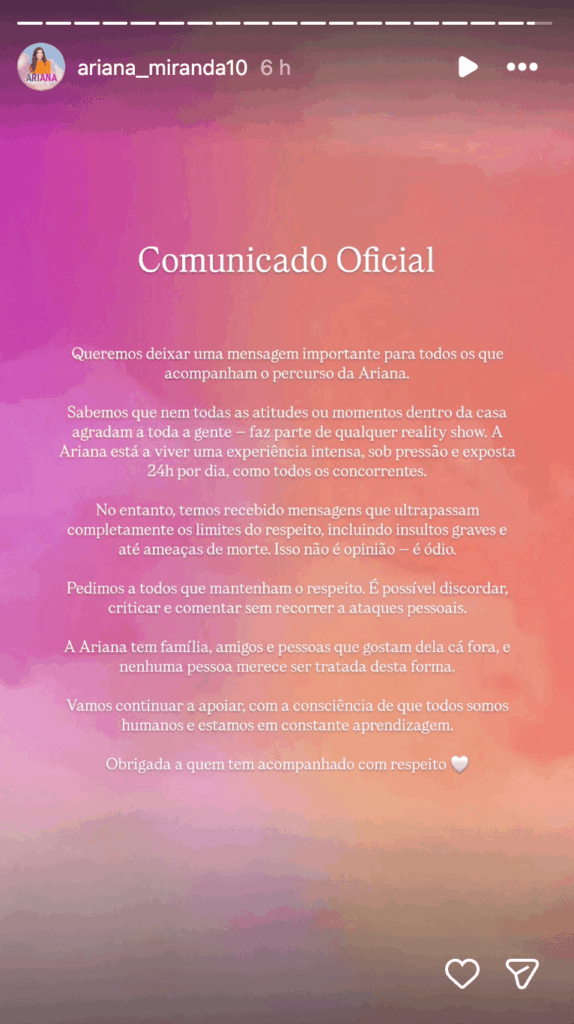 O apelo ao bom senso foi direto e sem rodeios, lembrando que é possível discordar sem destruir: “Pedimos a todos que mantenham o respeito. É possível discordar, criticar e comentar sem recorrer a ataques pessoais. A Ariana tem família, amigos e pessoas que gostam dela cá fora e nenhuma pessoa merece ser tratada desta forma.”