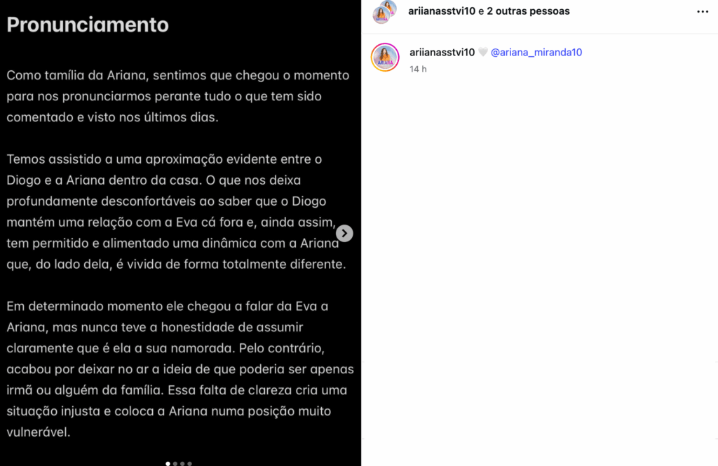 A família começou por contextualizar o motivo que a levou a quebrar o silêncio, deixando claro o desconforto com o que tem visto nas últimas semanas: “Como família da Ariana, sentimos que chegou o momento para nos pronunciarmos perante tudo o que tem sido comentado e visto nos últimos dias. Temos assistido a uma aproximação evidente entre o Diogo e a Ariana dentro da casa. O que nos deixa profundamente desconfortáveis ao saber que o Diogo mantém uma relação com a Eva cá fora e, ainda assim, tem permitido e alimentado uma dinâmica com a Ariana que, do lado dela, é vivida de forma totalmente diferente.”