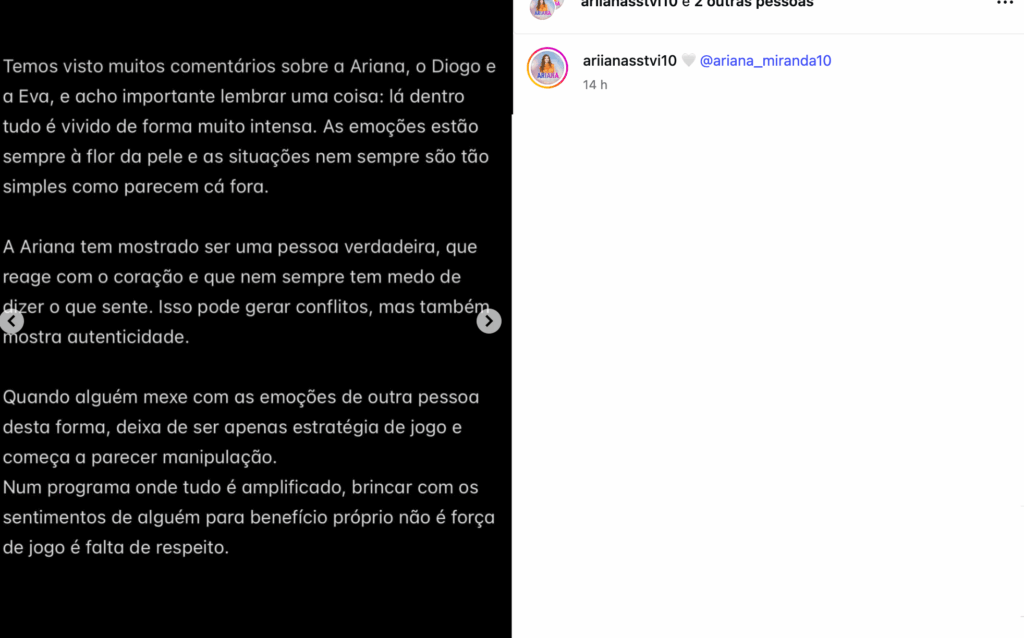 Reconhecendo a intensidade do ambiente dentro da casa, a família fez questão de defender o caráter da concorrente e de lembrar que Ariana está a reagir ao que lhe tem sido mostrado sem saber a verdade: “Temos visto muitos comentários sobre a Ariana, o Diogo e a Eva, e acho importante lembrar uma coisa: lá dentro tudo é vivido de forma muito intensa. As emoções estão sempre à flor da pele e as situações nem sempre são tão simples como parecem cá fora. A Ariana tem mostrado ser uma pessoa verdadeira, que reage com o coração e que nem sempre tem medo de dizer o que sente. Isso pode gerar conflitos, mas também mostra autenticidade.”