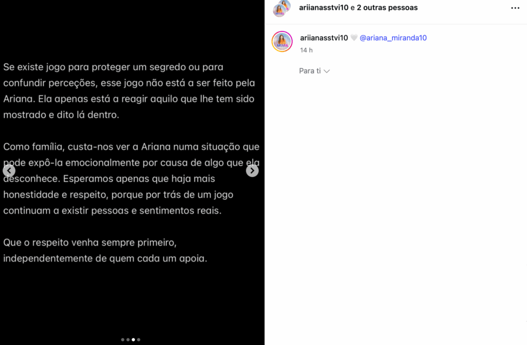 O comunicado fechou com uma mensagem de preocupação genuína pela exposição emocional de Ariana e um apelo ao respeito : “Como família, custa-nos ver a Ariana numa situação que pode expô-la emocionalmente por causa de algo que ela desconhece. Esperamos apenas que haja mais honestidade e respeito, porque por trás de um jogo continuam a existir pessoas e sentimentos reais. Que o respeito venha sempre primeiro, independentemente de quem cada um apoia.”