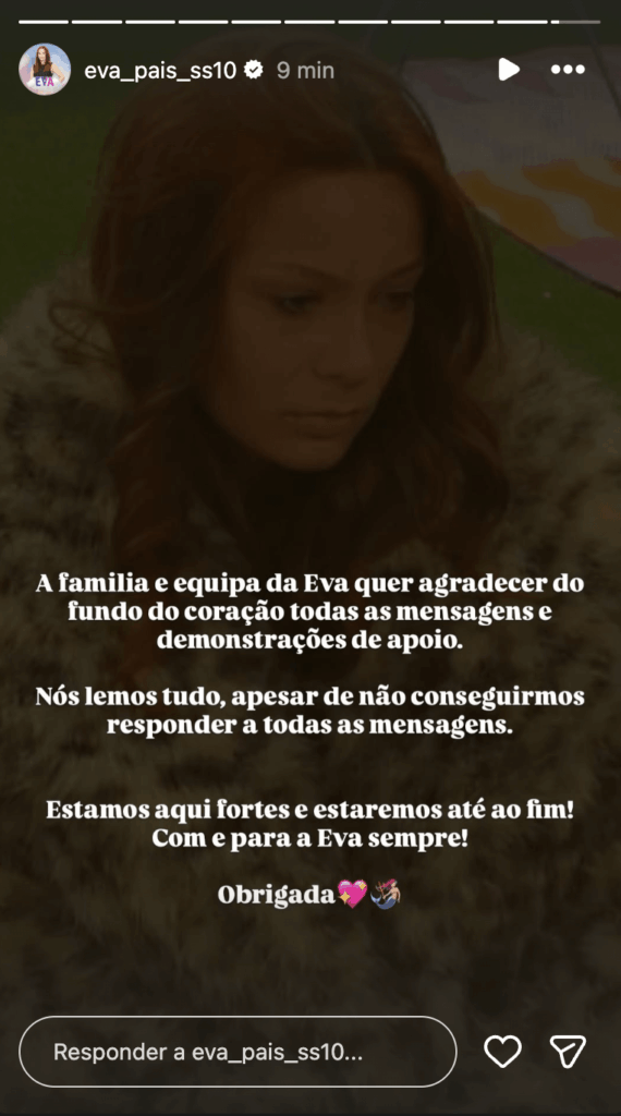 Cá fora, a família da concorrente acompanhou tudo de perto e, após uma noite intensa, não resistiu a quebrar o silêncio com uma mensagem de força e gratidão dirigida a todos os que têm apoiado Eva: “A família e equipa da Eva quer agradecer do fundo do coração todas as mensagens e demonstrações de apoio. Nós lemos tudo, apesar de não conseguirmos responder a todas as mensagens. Estamos aqui fortes e estaremos até ao fim! Com e para a Eva sempre! Obrigada.”